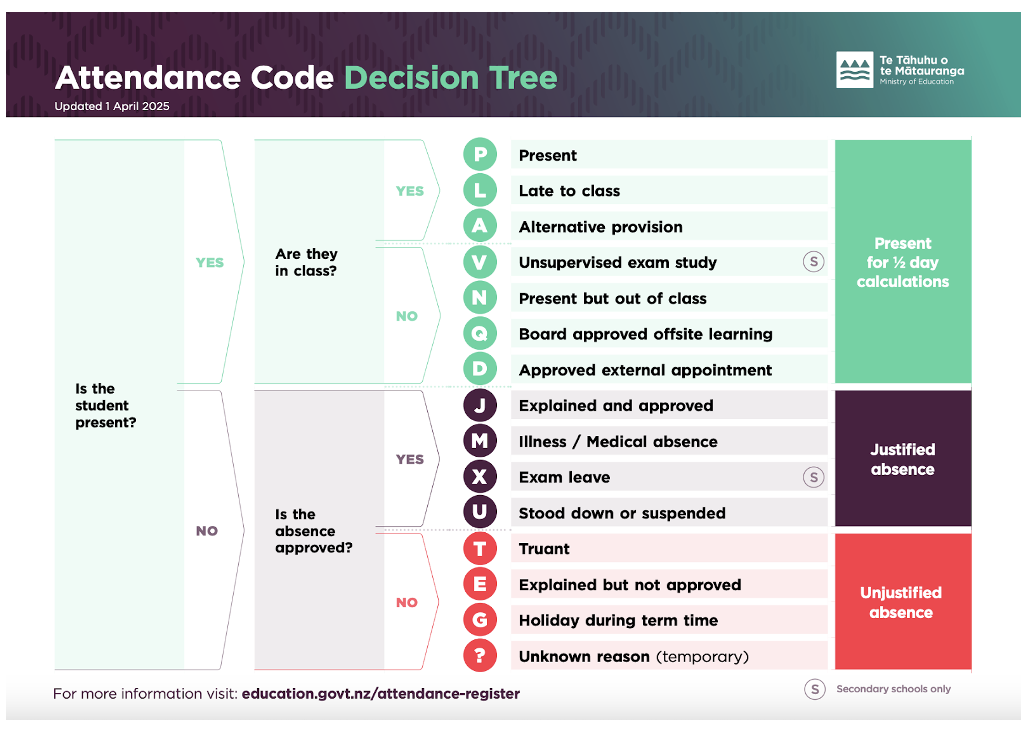 Please note: COVID is now coded as a regular medical absence. We appreciate that whānau will be observing isolation but COVID is no longer coded differently. The rule of thumb is if you are too sick to attend school, please stay home.